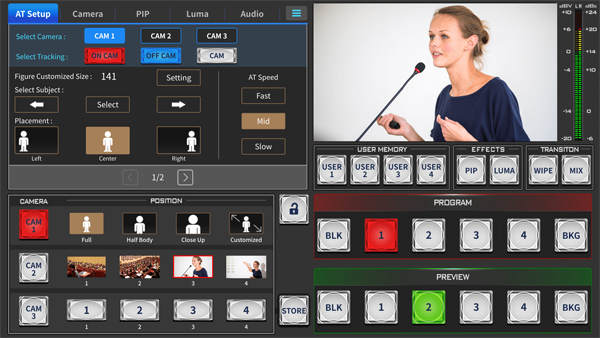 El HS-1650T incorpora una pantalla táctil de 14 pulgadas, que permite el control en tiempo real de cámaras PTZ, el cambio de escenas y la activación del seguimiento automático por IA, ofreciendo una experiencia de usuario intuitiva y centralizada.