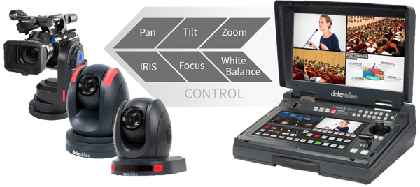 El HS-1650T cuenta con control PTZ integrado para hasta 3 cámaras PTZ Datavideo, operable mediante pantalla táctil o joystick físico. El sistema permite controlar pan, tilt, zoom, velocidad de movimiento y almacenar hasta 12 posiciones preestablecidas de cámara.