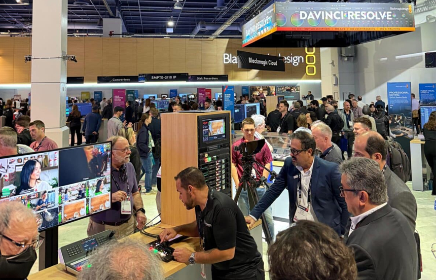 Fabio Angelini y Samuel Hafens realizan una demostración para clientes en el stand de Blackmagic Design.